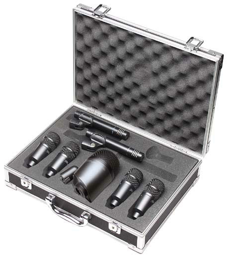 - Selection of microphones(7) and mounts(2) designed for recording the drum set and packed in a lightweight and durable carrying case that includes: one DM-5010 - Dynamic microphone for kick drum, four DM-5020 - Dynamic microphone for tom & snare drum, two CM-5050 - Electret condenser microphone for overhead recording, cymbals or hi-hat micing and two break-resistant swivel adaptors (rotating 180°) w/ universal 3/8" & 5/8" thread - ROHS Compliant.
