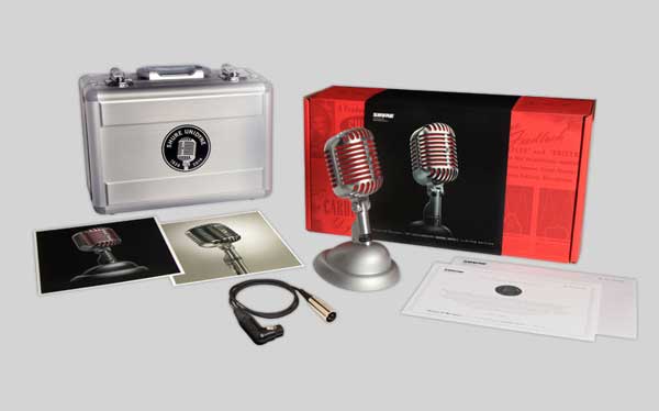 Shure 5575 LE Unidyne, limited 55 "Elvis" microphone for the 75. anniversary, limited quantity worldwide 5575 pieces, dynamic capsule, cardioid, 50 Hz - 20.000 Hz, -58 dBV/1,58 mV/Pa, especially for vocals and speech, red interior foam, Original Design with metall housing and Vintage Emblem, table stand made of diecast with silver polish, incl. 1m XLR cable, certificate of Authenticity of Rose Shure and Unidyne pictures coloured and black/white, Aluminium-Carry case