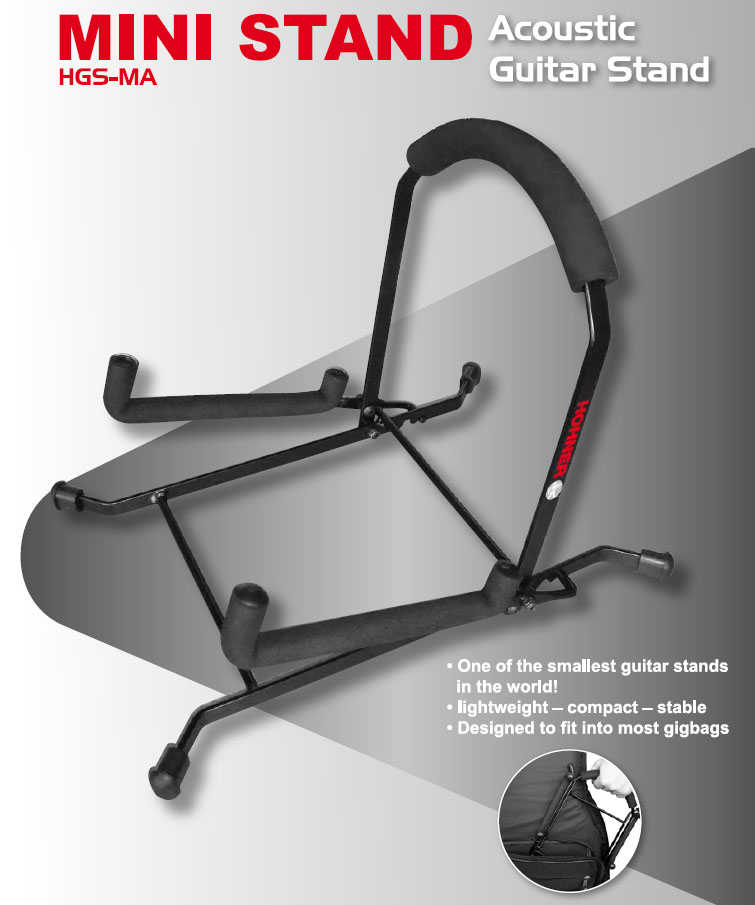 Hohner proudly presents one of the smallest guitar stands in the world: The HGS-ME (for E-Guitars) and HGS-MA (for Acoustic Guitars) were designed to easily fit into most gigbags. They are lightweight (only 580 / 620 gram), very compact and stable. The new Mini Guitar Stands are the perfect companions for guitarists who travel around a lot.