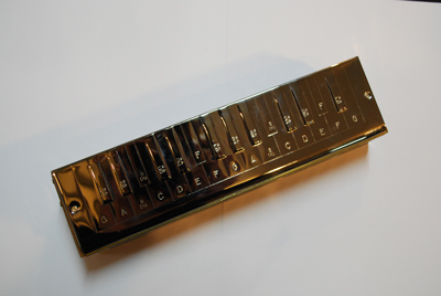 This is a Single Reed Bass. Hohner's #264 Bass or also known as the "G-Bass" because its range is two octaves, starting and ending on G. It has a hinged double deck set up but with a cover plate only on one side of each deck. It is set up in the same modified keyboard style as those basses already discussed. It has 29 reeds with 14 on the top deck and 15 on the bottom deck.