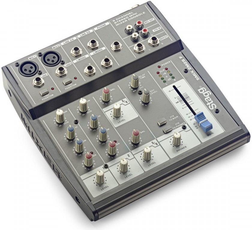 - 2-band EQ for each input channel - low-noise discrete Mic pre-amp on microphone inputs - headphone/monitor output - peak indicator on each mono channel - +48V phantom power for condenser microphones - built-in delay effect.